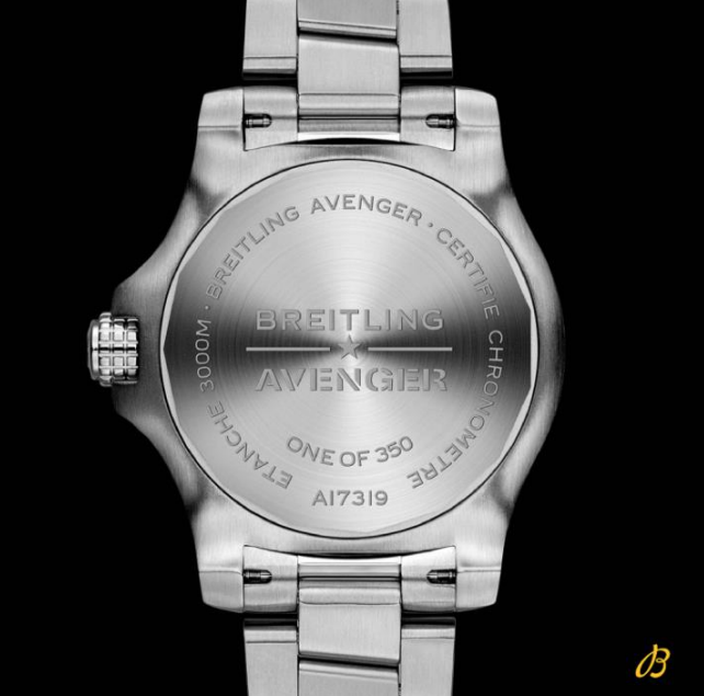 On top of the Breitling Avenger Automatic 45 Seawolf watch, a matching unidirectional rotating bezel is also delivered in stainless steel. Since the Avenger is designed with both pilots and divers in mind, the bezel features large ratcheting on its circumference for easy manipulation even while wearing thick gloves. There’s also an engraved 60 minute scale with large stencil-like Arabic numerals for each 15 minute point and a luminous round dot at the 12 o’clock position. Completing the case is a screw in crown and a screw down satin-finished titanium case back engraved with its limited edition status out of 350 pieces.