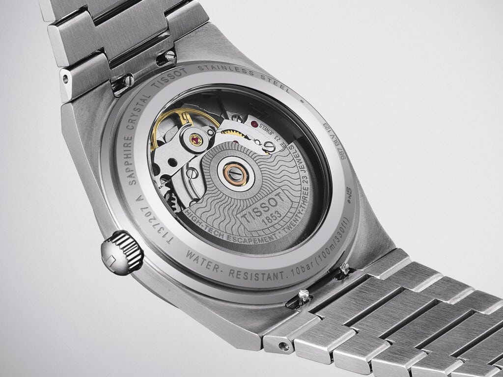 Like the previous PRX 40mm automatic watches, the new Tissot PRX 35mm Automatic releases are powered by the Swatch Group’s Powermatic 80 automatic winding movement. This is a movement that has received a lot of praise over the years. It was produced by ETA exclusively for the Swatch Group, offering a weekend-proof 80-hour power reserve and a frequency of 21,600vph. If that wasn’t already impressive at its price point, the Swiss made calibre is also equipped with a Nivachron balance spring for high levels of anti-magnetism. Finishing of the movement is pretty basic, as you’d expect, with some brushed and matte-blasted bridges and an oscillating rotor with a simple wave pattern.