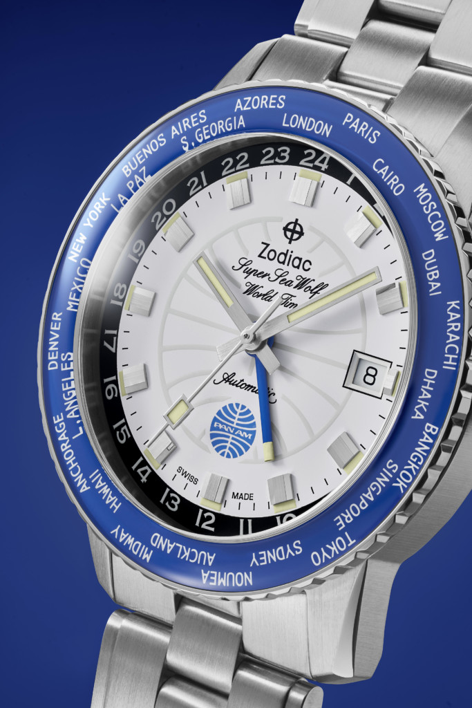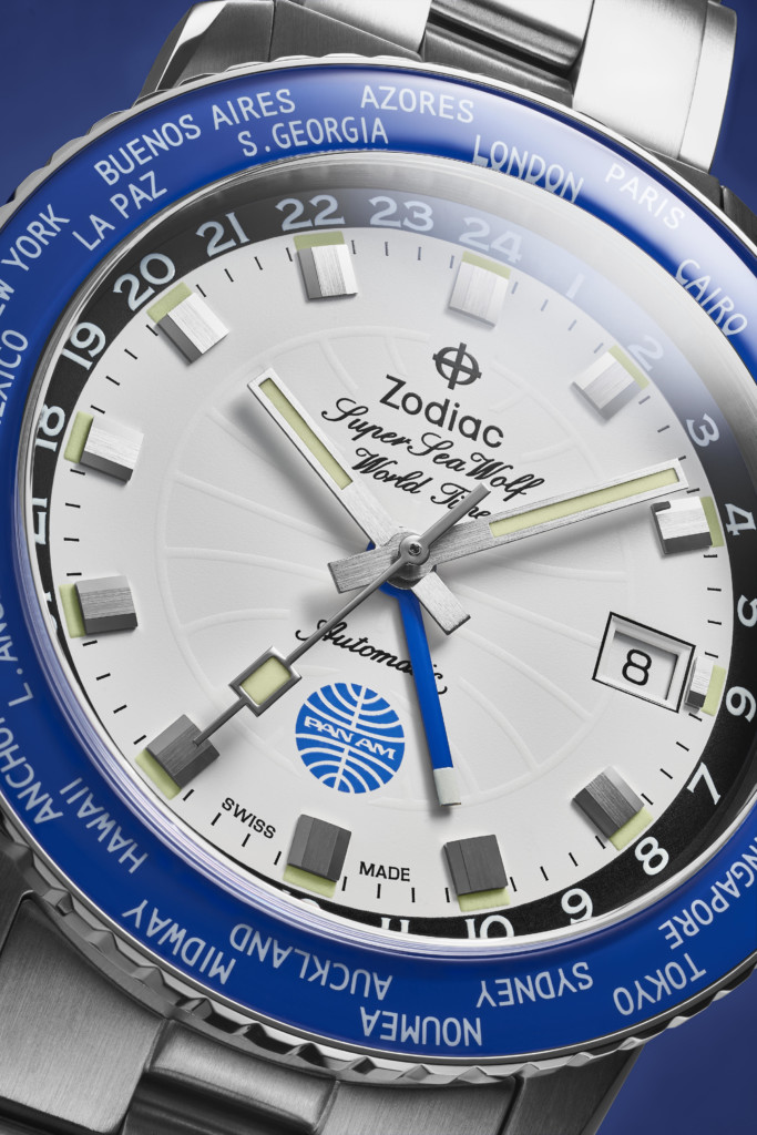 The Pan Am theme continues onto the dial of the new Zodiac Super Sea Wolf World Time GMT Pan Am Limited Edition watch which is finished in a crisp opaline white and embossed with the Pan Am globe in off-white directly at the centre. There’s also a second Pan Am logo placed at 6 o’clock, this time in the familiar shade of blue. The dial is clean yet striking, pairing its almost complete two-toned attire with a black outer chapter ring for the 24 hour scale, silvered box-shaped hour markers, baton hands for the hours and minutes and a square-tipped lollipop seconds hand. The indexes and all four hands are generously adorned with glow in the dark Superluminova for easy readability in low lighting.