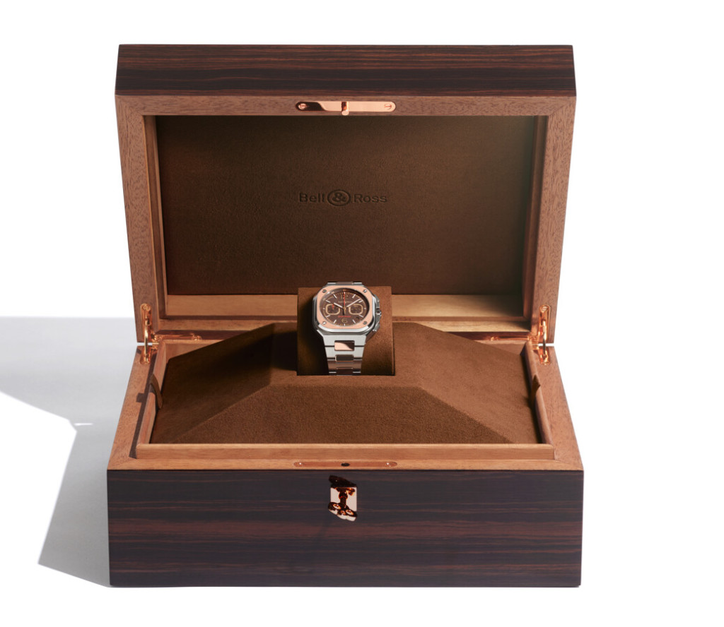 The Bell & Ross BR 05 Chrono Edicion Limitada Limited Edition is available on a choice of two straps. For a sportier and more affordable option, the design comes on a brown rubber strap with a vertical grooved pattern. The more opulent option is the 4N rose gold and stainless steel bracelet which matches effortlessly with the rest of the dual-toned case. With the sale of every 250-piece Bell & Ross BR 05 Chrono Limitada Edicion, you’ll also get a special wooden box embossed with the Bell & Ross logo on top in the form of a cigar ring in gilded steel and 5N gold. Inside the case, once you’ve removed the timepiece from within, the box is designed to be used as an authentic cigar case.