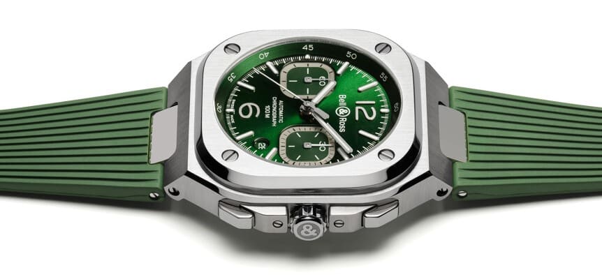The new green dial of the Bell & Ross BR 05 Green Steel watch is – quite literally – a breath of fresh air. The metallic green hue has never been placed on a BR 05 watch before with a steel case, previously only appearing on the more opulent BR 05 Gold. The glossy green sunray centre pairs beautifully with the polished accents of the square-shaped case and the choice of a green ribbed rubber strap or integrated steel bracelet. The dial is joined by two matching green subsidiary counters at 3 and 9 o’clock for the small seconds and chronograph minutes, each with snailed decoration and recessed silver tracks for easy legibility. The rest of the Bell & Ross BR 05 Green Steel watch’s dial follows suit providing clear readability with two large silver numerals for the 12 and 6 o’clock markers, stick indexes and thick baton hands, all with glow in the dark Superluminova inserts.
