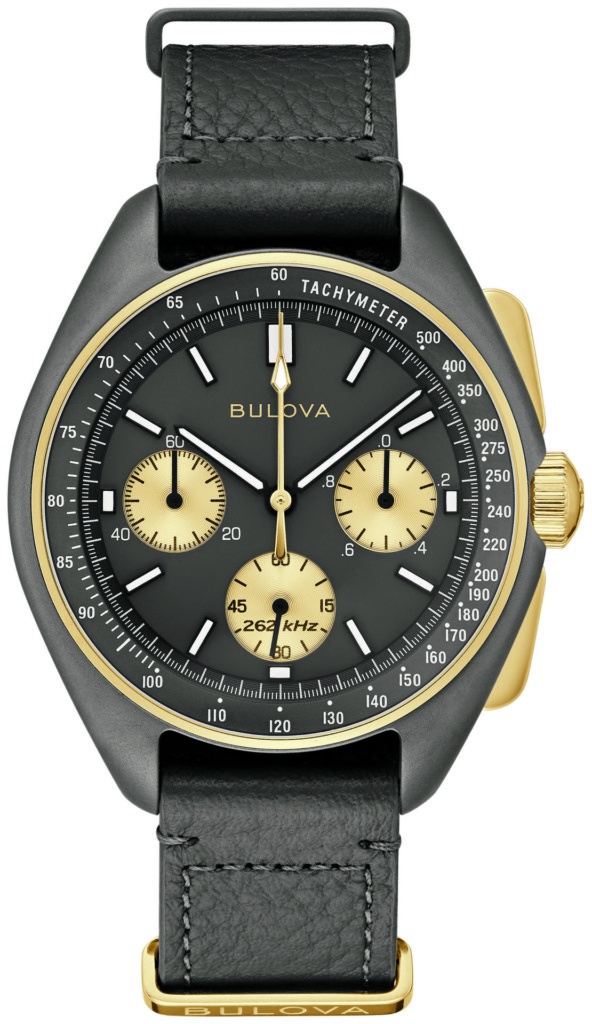 At the centre, the Bulova Lunar Pilot 50th Anniversary Limited Edition revives the original dial design with a smooth anthracite grey backdrop this time adorned with three golden subsidiary dials, golden central hands for the hours, minutes and chronograph seconds and the original Bulova logo at 12 o’clock. On the counter at 6’clock, the reference to 262 kHz refers to the use of Bulova’s proprietary high-performance quartz movement, previously known as UHF or Ultra-High Frequency movement. The quartz calibre promises an outstanding accuracy of 10 seconds of variation a year and ensures the satisfying smooth sweep of the chronograph seconds hand.