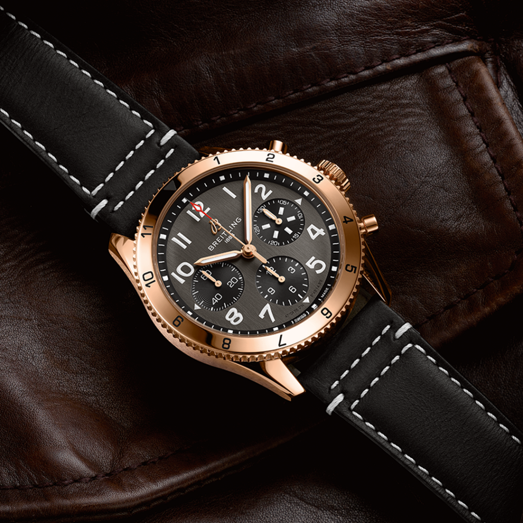 All of the Breitling Classic AVI Chronograph 42 watches follow suit in their core specifications. We’re promised 42mm-wide cases with bold, bi-directional rotating bezels with fine ratcheting for easy manipulation in the cockpit. The bezels are engineered from steel, black ceramic or 18ct rose gold depending on the model and come engraved with a 12-hour scale. The cases are 14.7mm tall and offer 100 metre water resistant ratings thanks to the screwed in case back which comes engraved with its corresponding planes’ silhouette. Each watch is also available on a metal bracelet or a calfskin leather strap.