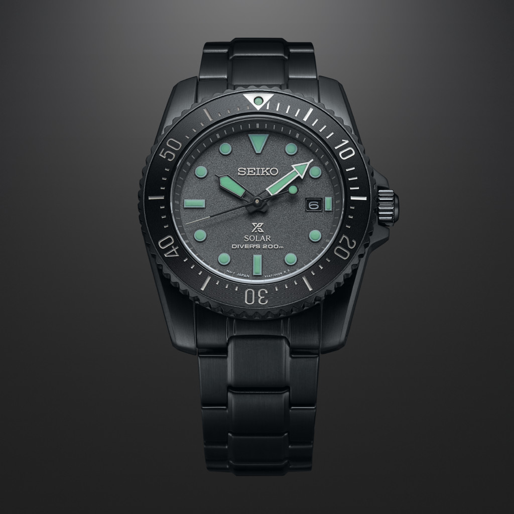 The rest of the design for the Seiko Prospex Black Series ‘Night Vision’ Solar Divers watch takes inspiration from Seiko’s 1965 Diver’s watch, also known as Japan’s first ever Japanese diving instrument watch which was famously worn on Japanese Antarctic Expeditions until 1969. It features a black hard coated stainless steel case with a 38.5mm diameter and height of 10.6mm and a grooved 60 minute unidirectional bezel. For a 200 metre water resistance, we’re also promised a screw down crown, screwed case back and sapphire crystal glass. The textured grey dial mirrors the rest of the series with bright green luminous hardware and yet differs as the only design equipped with a three-link stainless steel bracelet complete with black hard coating.