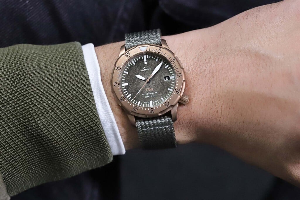 The new Sinn T50 watches have a lot in common with their stainless steel counterparts, the Sinn U1 and U50. There’s the same beadblasted finishing on the cases, strong yet compact lugs, a captive bezel with precision scale and a highly luminous dial. There are some notable changes however, not withstanding of the new titanium and Goldbronze materials. The bezel is now scalloped with eight notches around its circumferences and the new oversized sword hands pair with smaller, baton-shaped markers. It feels like a much more cleaner finish and one we are certainly on board with.