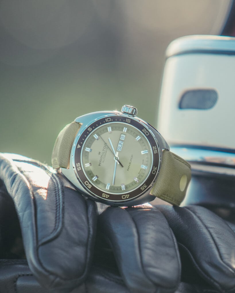 Swiss watchmaker Hamilton launches two new editions of their retro-inspired American Classic Pan Europ Day Date Auto watch, now available with a light green or beige sunray-finished dial.