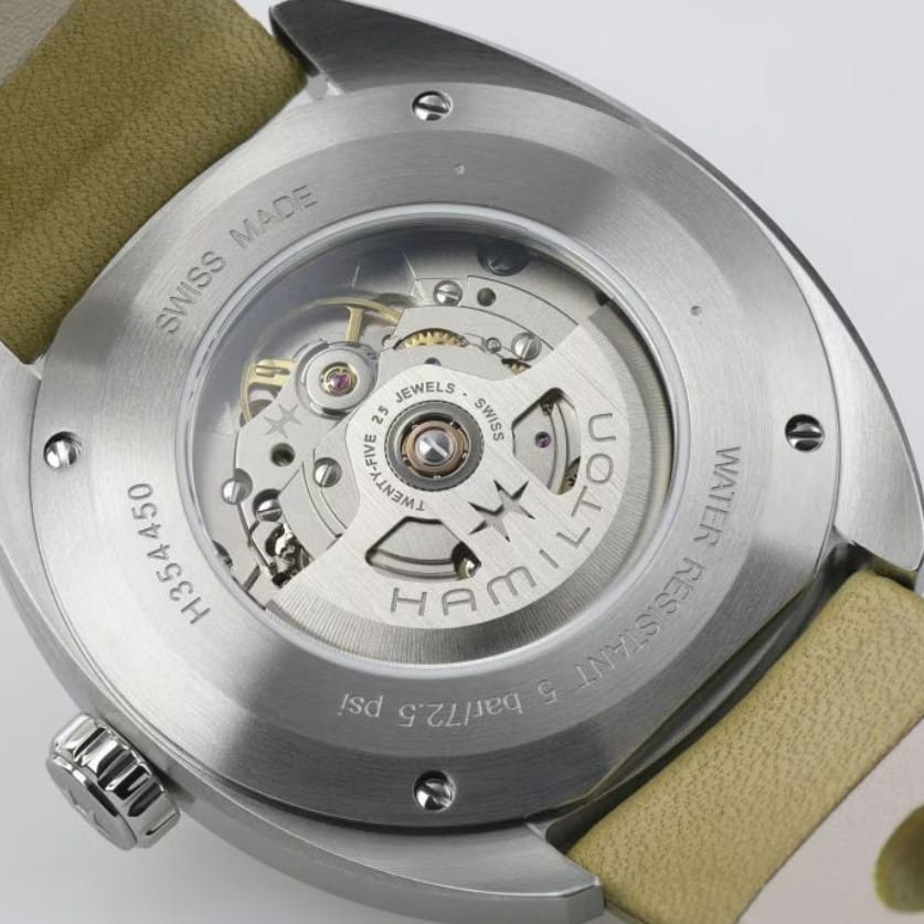 The cases of the new Hamilton American Classic Pan Europ Day Date Auto watches offer much of the same spec as previous re-editions. They are engineered from stainless steel with cushion-shaped architecture sized to 42mm in diameter and 11.55mm in height. There’s sapphire crystal glass on both the front and back, the back secured by four screws and offering a nice clear view of the movement inside. The front glass is flat and adorned with anti-reflective treatment for easy legibility of the dial. The cases also feature non-screw locked crowns signed off by the brand’s “H” logo and a handsome aluminium, unidirectional rotating bezel. Interestingly, Hamilton have chosen to colour the bezels of both models in a deep burgundy, which nicely compliments both the green and beige dials. The bezel has a printed 60 minute diving scale in its respective dial colour, but we don’t advise taking the Hamilton American Classic Pan Europ Day Date Auto watches too far out in the water, as the water resistance rating lies at just 50 metres.