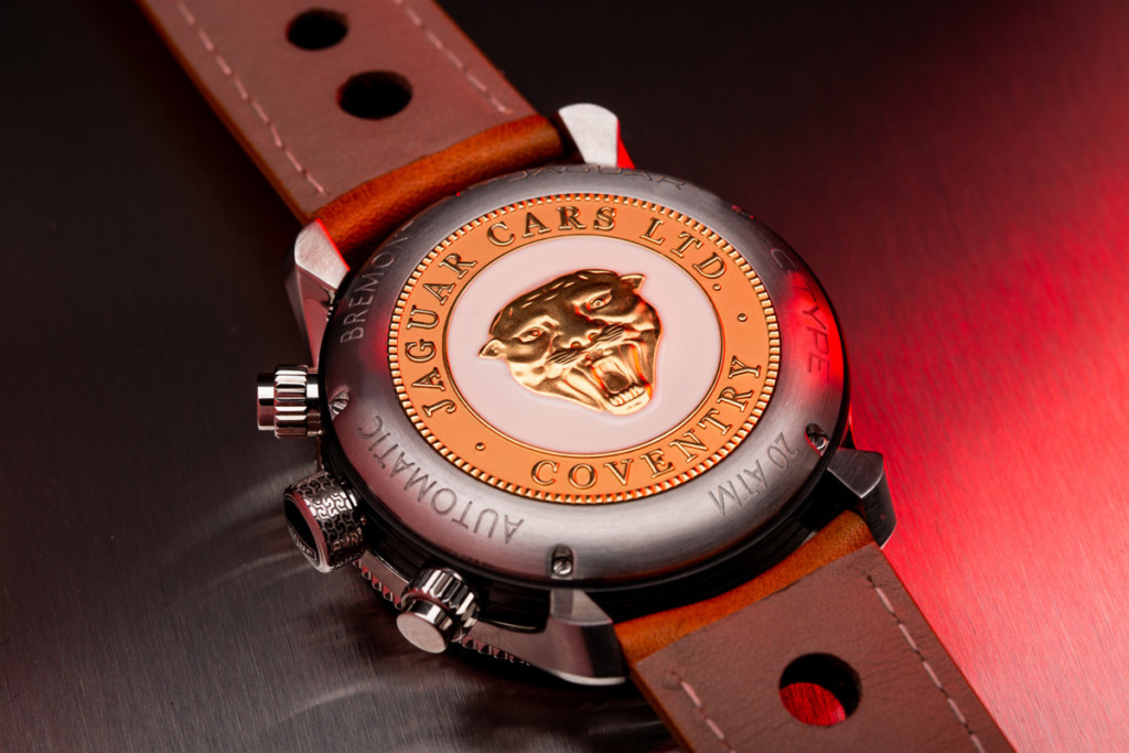 The engine responsible for driving the Bremont Jaguar C-Type watch is the BE-50AV automatic winding movement, a chronometer-certified calibre equipped with a Glucydur balance wheel, Anachron balance spring and an anti-magnetic Nivaflex mainspring. We’re also promised hours, minutes and central sweeping chronograph seconds, a date complication, small seconds and a 30 minutes counter supported by a 42 hour power reserve, 27 jewels and a frequency of 28,800vph.