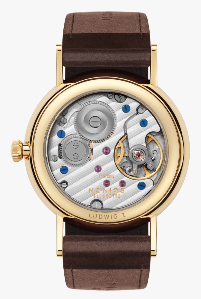 Responsible for powering the complications of the NOMOS Ludwig Gold 33 watch is the brand’s original in-house movement, the Alpha, which first debuted in 2005. It promises 17 jewels, a frequency of 21,600 vibrations per hour and a 43-hour power reserve. It’s also adjusted in six positions and boasts chronometer level accuracy. When off the wrist, you can admire the manual-winding movement through the sapphire crystal glass case back including decorations like Côtes de Genève and a sunburst pattern on the ratchet and crown wheel.