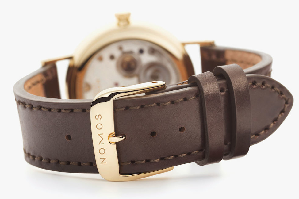 The perfectly round case of the NOMOS Ludwig Gold 33 watch is crafted from 18 carat 3N gold and shares the brand’s classic design language with a minimalistic approach, sloping lugs and a height of only 6.6 millimetres. The case also reveals a thin unadorned bezel, a small knurled non-screw locked crown at 3 o’clock and a splash-proof 30 metre water resistant rating. Securing the unisex watch to the wrist is a Horween Genuine Shell Cordovan strap in brown with tone-on-tone stitching and a matching 18ct gold winged clasp.