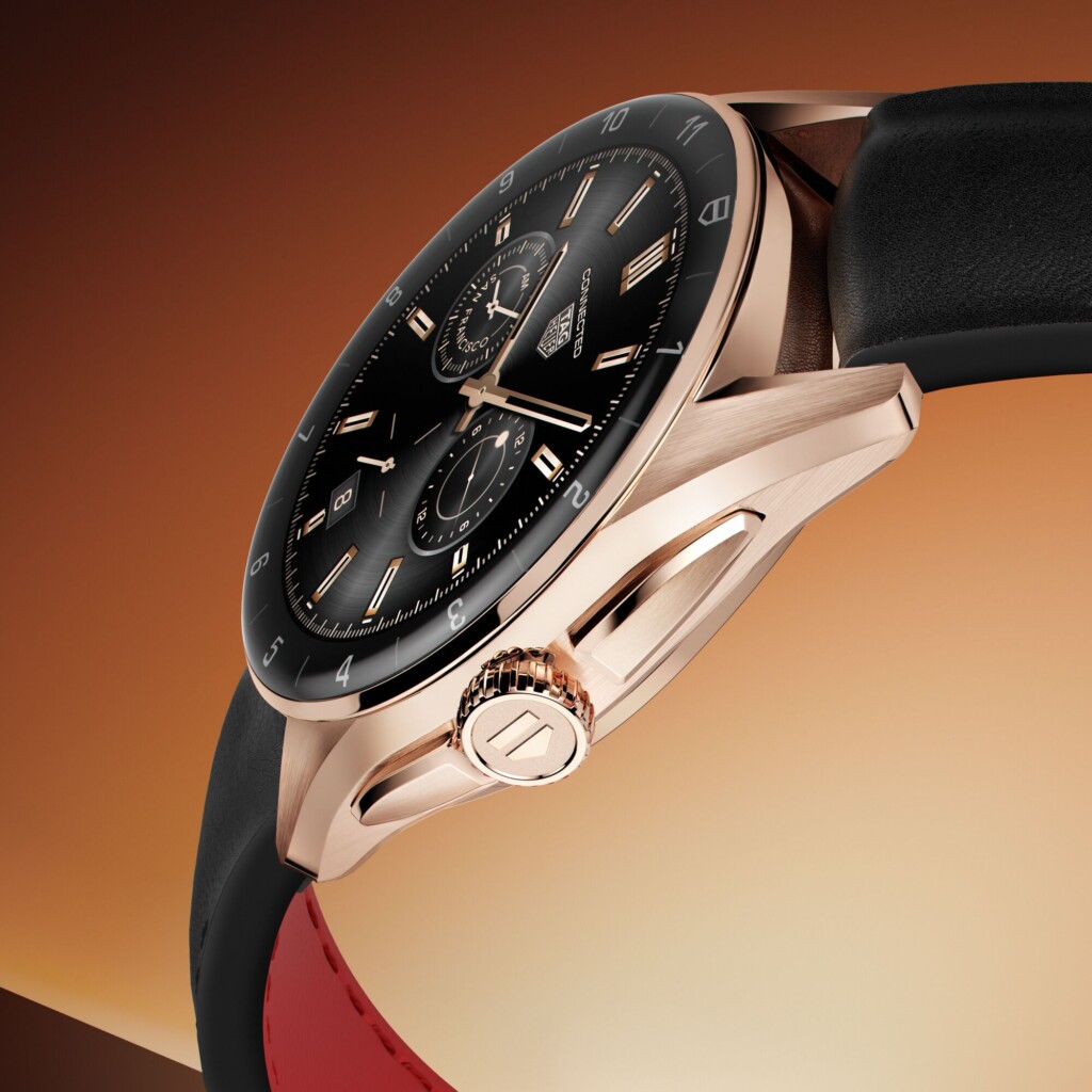 A resolutely elegant smartwatch, the TAG Heuer Connected Calibre E4 Golden Bright Edition instead opts for a smaller, 42mm stainless steel case coated entirely in rose gold PVD. This is the first TAG Heuer smartwatch presented in full gold PVD and we have to say, it gives a really nice finish, nicely blurring the lines between a dress watch and a sports smartwatch. The gold boasts alternate brushed and polished finishing and extends across the crown, pushers and case back. Unlike its 45mm counterpart above, the TAG Heuer Connected Calibre E4 Golden Bright Edition has little to no bezel but just beautifully smooth sapphire crystal glass flowing into the sides of the case – again attesting to its dressier finish. The design is completed by a black calfskin leather strap with red lining and a gold folding buckle with double safety push buttons.