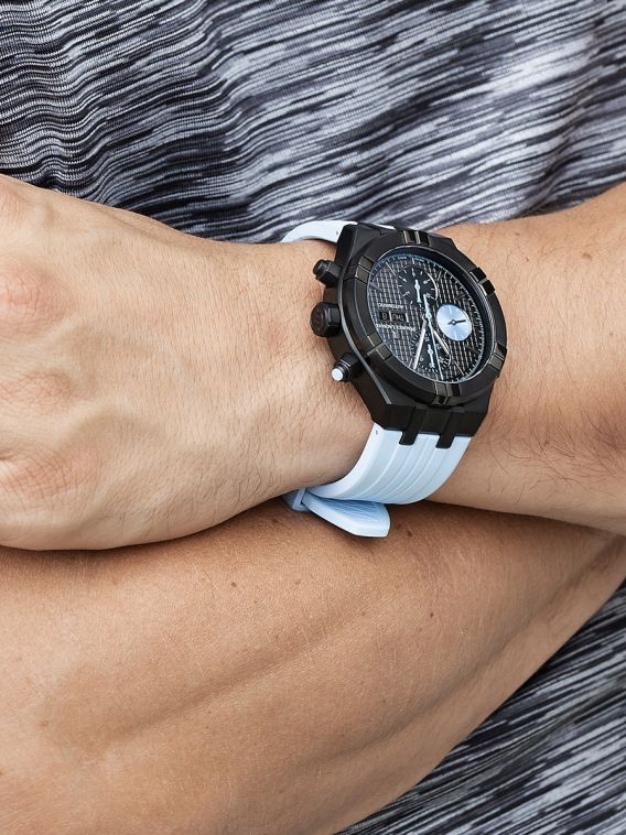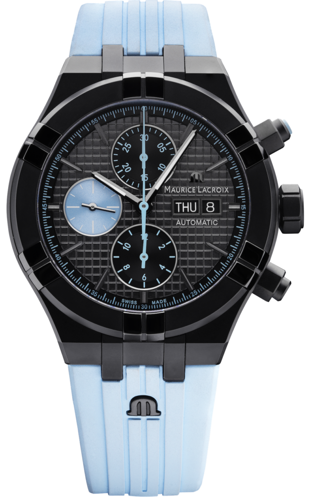Like the pastel blue elements on the dial, the strap breaks up what would otherwise be an entirely all-black watch with a charming light blue finish. The strap is engineered from FKM rubber and is secured by a black DLC pin buckle. Like all Aikon watches, the strap of the Maurice Lacroix Aikon Sprint Chronograph is also decorated with the brand’s ‘M’ logo, matching the rest of the aesthetic with a polished black coating.
